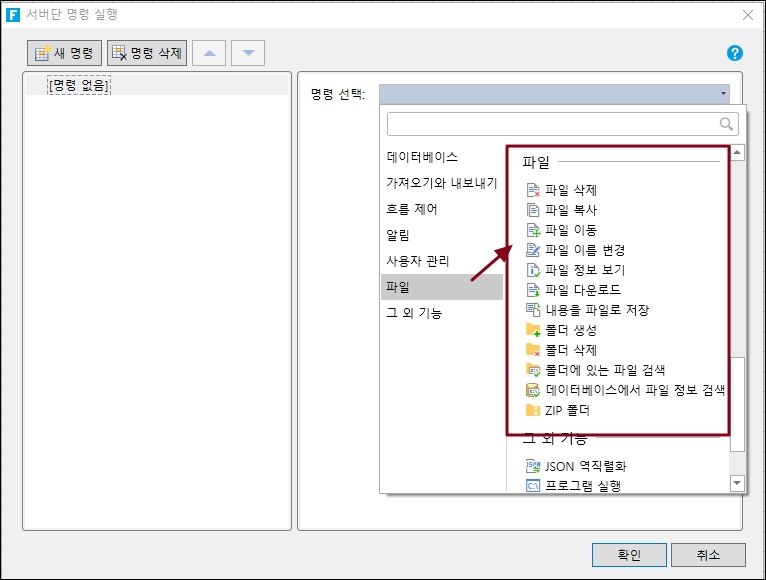 서버단 명령실행에서는 파일의 삭제, 복사 및 파일 정보를 취득할 수 있습니다.