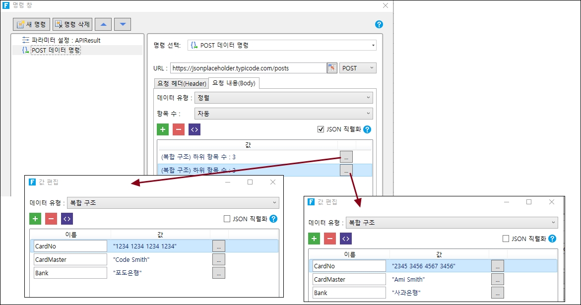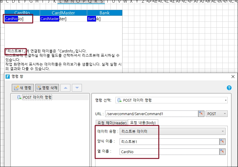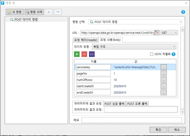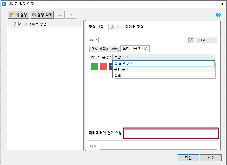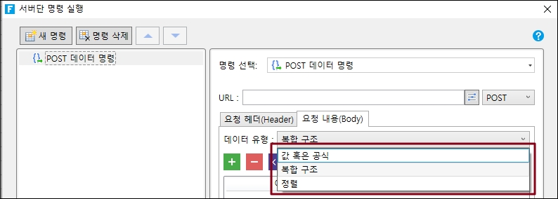 명령창에서 "POST 데이터 명령"을 선택하고 아래와 같이 설정합니다.