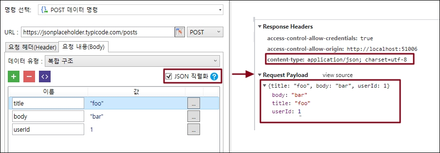 3-2. JSON 직렬화에 체크를 하면 Content Type이 "application/json; charset=UTF-8"인 것을 확인할 수 있습니다.