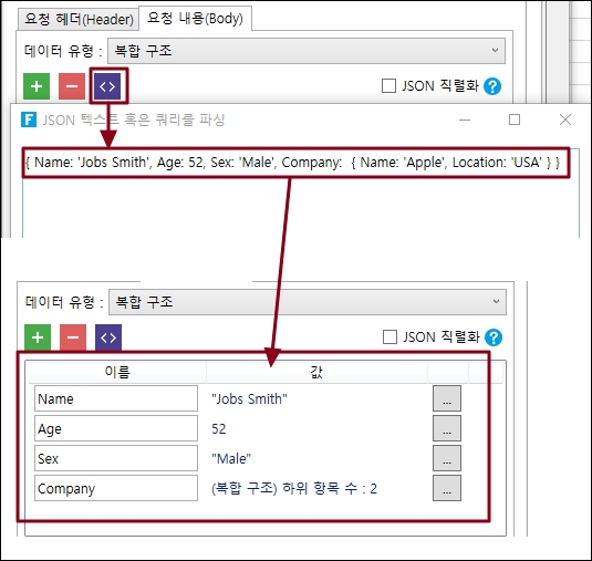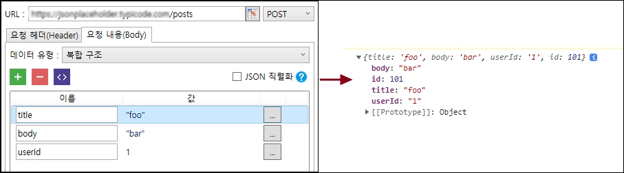 복합구조 : 서버로 보내는 데이터에 어떤 속성이 있음을 의미합니다.