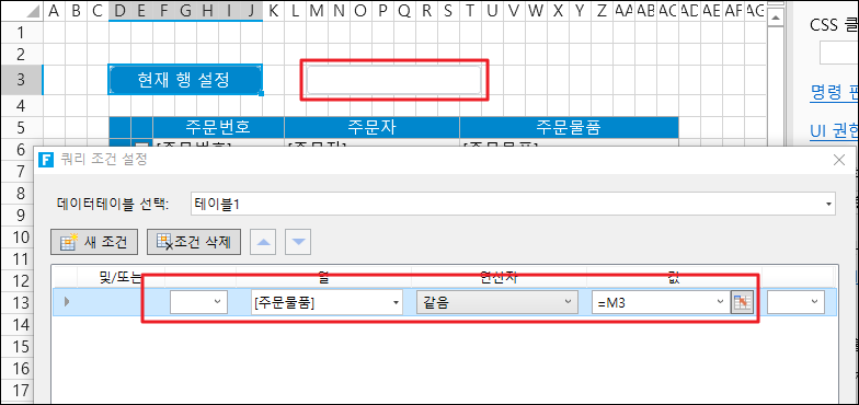 "현재 행 설정"을 클릭하면 쿼리 조건 설정창이 나타나며, 현재행의 조건을 설정합니다.&#x20;