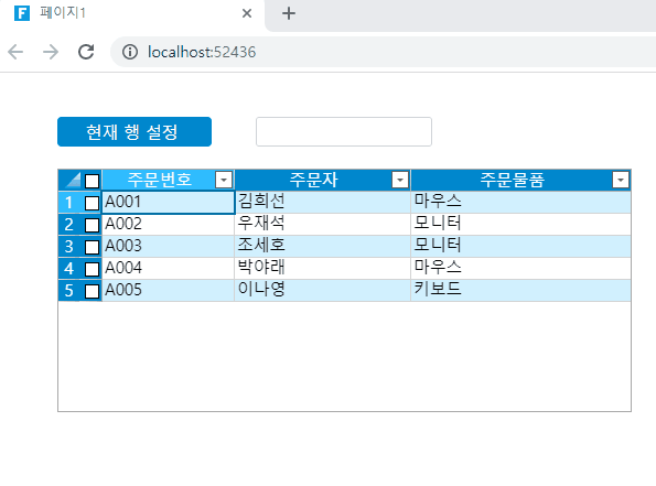 5\. 실행을 한 후, 텍스트 박스에 셀을 입력한 후 "현재 행 설정"버튼을 클릭하면 리스트뷰에서 텍스트박스의 내용이 있는 행으로 이동하는 것을 확인할 수 있습니다.