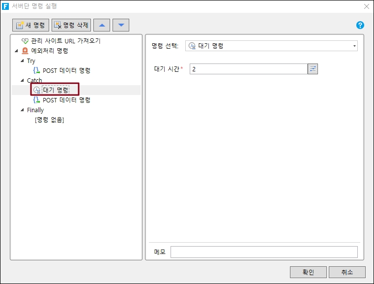 서버 명령에서 "대기 명령"을 선택하고 대기 시간만 설정합니다.