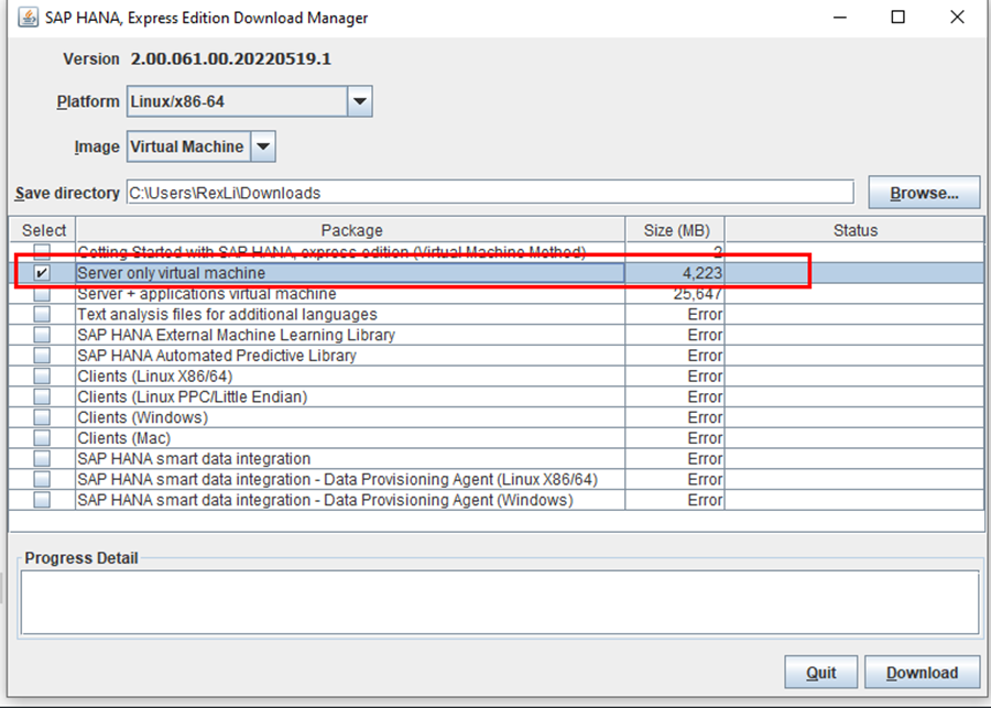 1. 하나 데이터베이스는 Linux 에서만 실행할 수 있습니다 . 로컬 Linux 가상 머신 에서 개발하려면 "Sap Hana Express Edition 2.0 sps06"을 사용합니다 . 이러한 서버는 다음 단계를 통해 얻을 수 있습니다. 다른 버전을 구할 수 있는 방법이 있다면 이를 따를 필요는 없습니다. 실행 중인 Hana 데이터베이스의 버전에 관계없이 LiveType은 Hana 클라이언트와 서버가 상호 호환되기 때문에 성공적으로 연결됩니다.