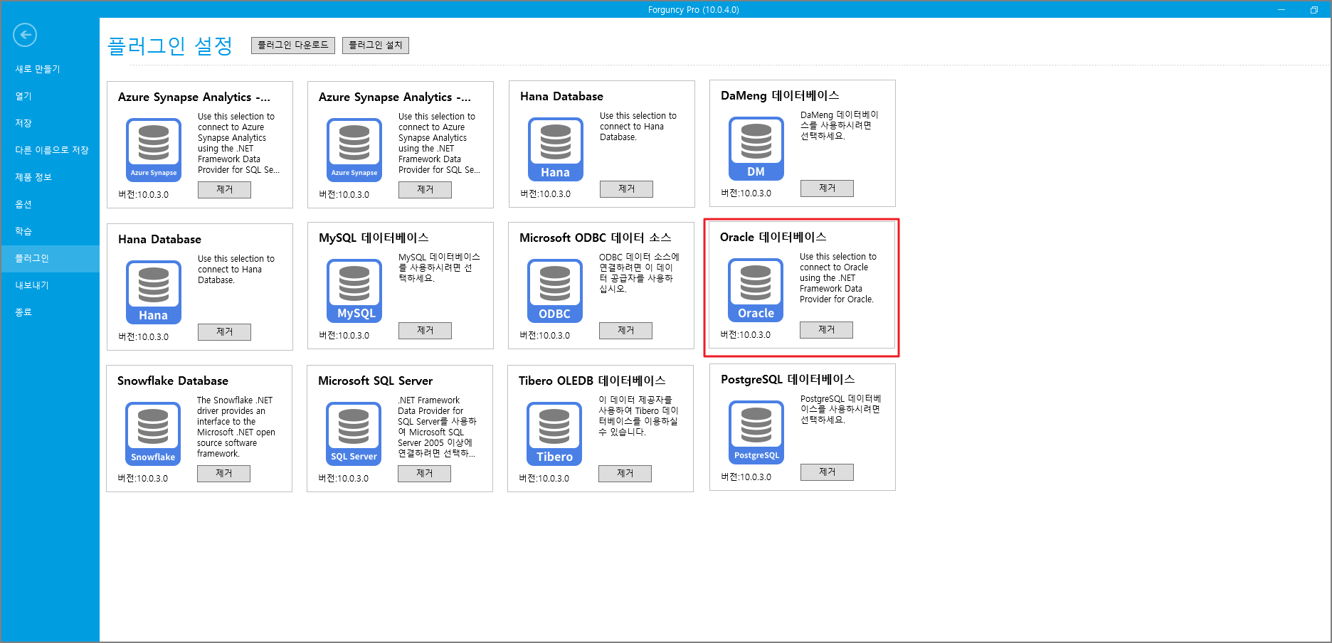포건시는 데이터베이스 플러그인( Oracle 등)은 플러그인 형태로 제품에 내장되어 있어 수동으로 설치할 필요가 없습니다.&#x20;