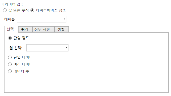 <table><thead><tr><th width="150">설정 </th><th>설명 </th></tr></thead><tbody><tr><td>파라미터 이름 </td><td>파라미터의 이름 </td></tr><tr><td>파라미터 값 </td><td><p></p><ul><li>값 또는 수식: 고정 값 또는 수식을 설정할 수 있습니다.</li><li><p>데이터 테이블에서: 데이터 테이블을 선택합니다.</p><ul><li>선택: 값, 단일 행 레코드, 여러 행 레코드 또는 행 수를 선택할 수 있습니다. 값을 선택할 때 값을 표시할 열을 선택해야 합니다. 단일 행 레코드 또는 여러 행 레코드를 선택할 때 열을 추가하고 변수 이름을 설정해야 합니다.</li><li>쿼리: 쿼리 조건은 쿼리 조건이 설정된 다른 곳에서 사용되는 것과 동일한 방식으로 설정됩니다.</li><li>상위 제한 : 표시/건너뛰려는 데이터의 행 수를 설정합니다.</li><li>정렬: 필요에 따라 데이터의 데이터 정렬을 설정합니다.</li><li><img src="https://1164392614-files.gitbook.io/~/files/v0/b/gitbook-x-prod.appspot.com/o/spaces%2FzxNQdilex6YN3fZKZhGM%2Fuploads%2FIOrVBSvCLSzxOrFlV896%2Fimage.png?alt=media&#x26;token=ae33bacf-ab77-48c2-a088-980ab9eb4867" alt=""></li></ul></li></ul><p><br></p></td></tr></tbody></table>