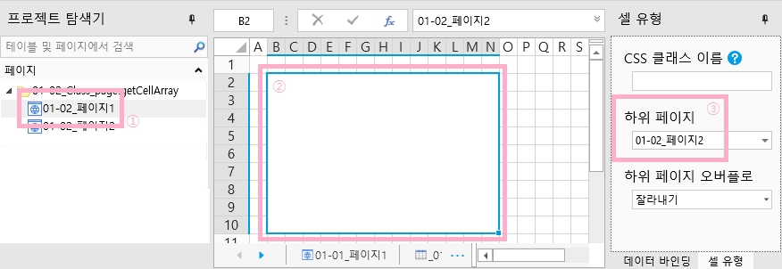 Forguncy에서 빈 페이지 2개를 생성합니다. “페이지1”에서 아래와 같이 셀 범위를 선택 > 셀 유형을 “내용이 포함된 셀 타입” 선택 > 하위 페이지로 “페이지2”를 지정합니다.