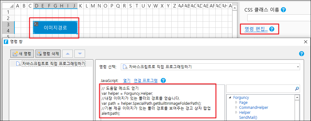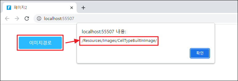 ![](https://help.grapecity.com.cn/download/thumbnails/72366330/%E6%AD%A5%E9%AA%A42.png?version=1\&modificationDate=1648092746000\&api=v2)페이지를 실행합니다. 버튼을 클릭하면 그림이 내장된 폴더의 경로를 보여 주는 경고 상자가 나타납니다.