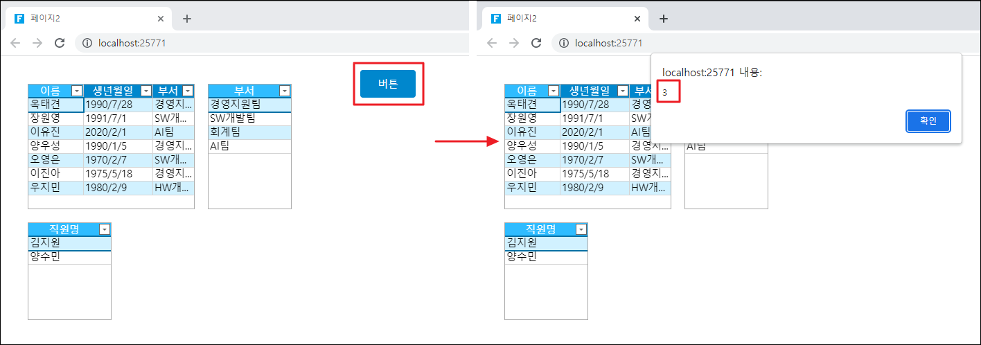 페이지를 실행하고 페이지에서 버튼 클릭하면 가져온 하위 페이지의 모든 테이블 인스턴스 길이를 보여 주는 경고 상자가 나타납니다.<br>