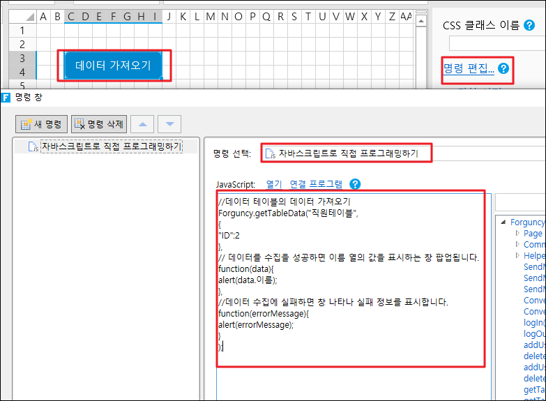 ![](https://help.grapecity.com.cn/download/thumbnails/78807338/%E6%AD%A5%E9%AA%A41.png?version=1\&modificationDate=1663664849000\&api=v2) 페이지에서 셀 범위를 선택하고 셀 유형을 버튼으로 설정하고 명령을 \[JavaScript 명령]으로 편집하고 JavaScript 코드를 입력합니다.