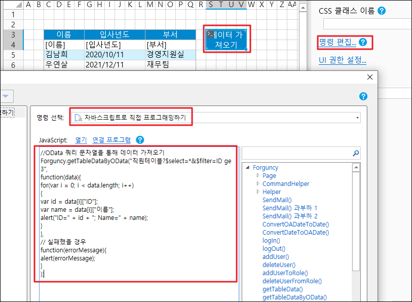 ![](https://help.grapecity.com.cn/download/thumbnails/78807365/%E6%AD%A5%E9%AA%A42.png?version=1\&modificationDate=1663665336000\&api=v2) 셀 범위를 선택하고 셀 유형을 버튼으로 설정하고 명령을 \[JavaScript 명령]으로 편집하고 JavaScript 코드를 입력합니다.