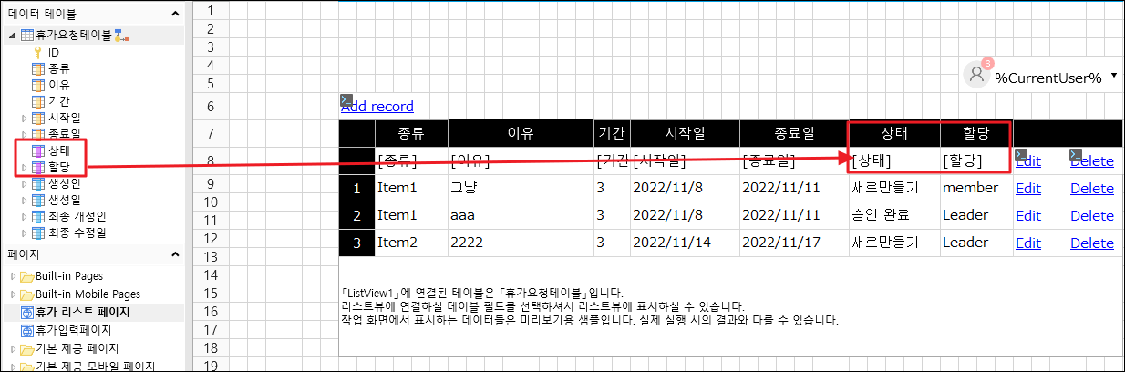 워크플로우를 설정하면  테이블에 상태,할당 정보가 추가됩니다. 해당 정보를 리스트뷰에 사용할 수 있습니다.