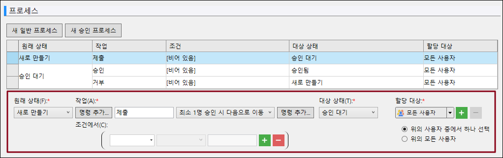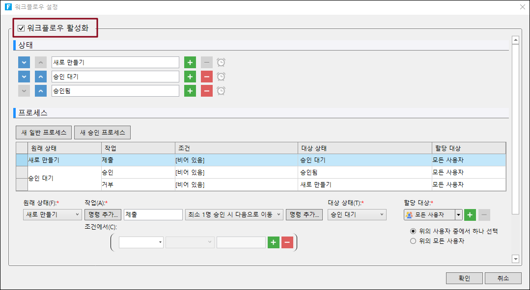 목록에서 단계 행을 선택하여 단계의 정의, 즉 단계의 원래 상태, 작업, 조건, 대상 상태 및 담당자를 수정합니다. +와 -를 클릭하여 단계를 늘리거나 제거합니다.