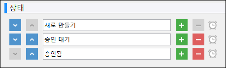 상태를 늘리거나 삭제하려면 +"-를 클릭할 수 있으며, 상태 이름은 자유롭게 정의할 수 있으며 순서는 위쪽 및 아래쪽 화살표를 클릭하여 변경할 수 있습니다.
