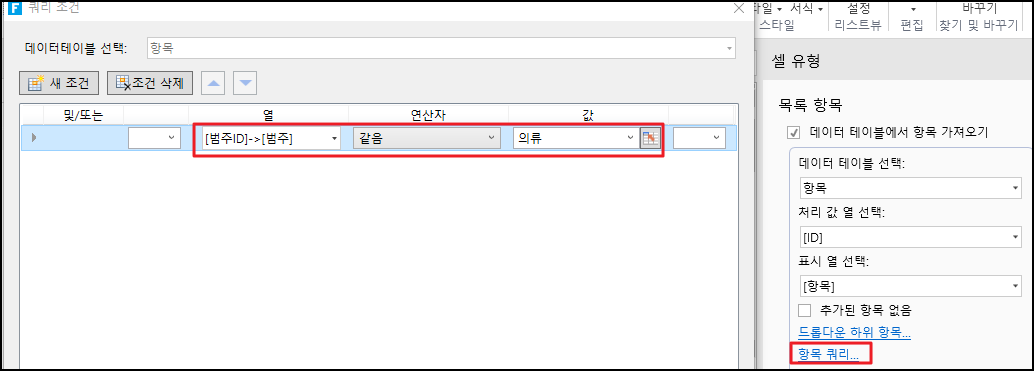 여러 쿼리 조건, 여러 조건 및/또는 관계 연결을 추가할 수 있습니다. 쿼리 조건을 선택하고 \[조건 삭제]를 클릭하여 쿼리 조건을 삭제합니다. 쿼리 조건을 위 또는 아래로 이동하려면 클릭합니다.![](https://help.grapecity.com.cn/download/thumbnails/72353144/image2018-12-18_14-21-41.png?version=1\&modificationDate=1648092541000\&api=v2)