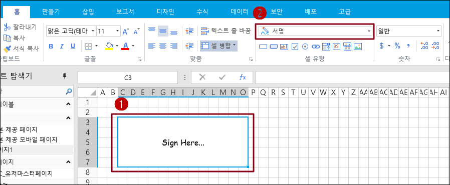 3. 셀영역을 선택하고 셀 유형을 서명으로 설정합니다.&#x20;