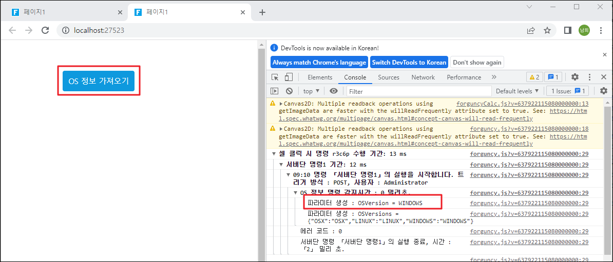 5\. 실행하고, 버튼을 클릭하면 OS 정보를 확인할 수 있습니다.&#x20;