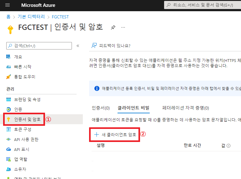 7\. Certificate & secrets을 선택하여 Client Secret을 가져옵니다.&#x20;