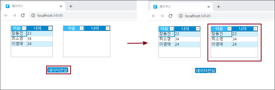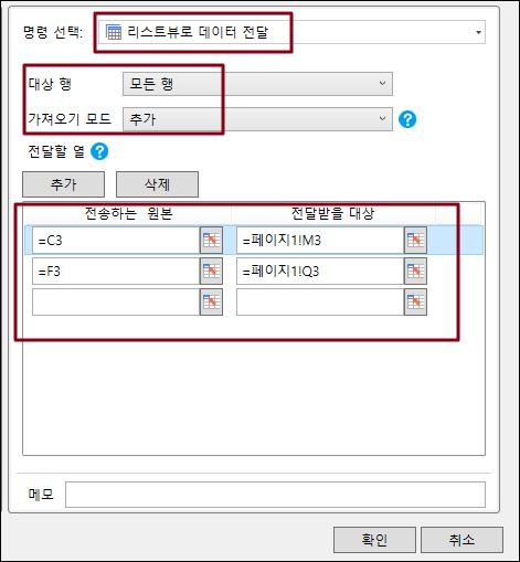 리스트뷰로 데이터 전달 명령을 사용하면 페이지간에 리스트뷰에서 다른 리스트뷰로  데이터를 전달할 수 있습니다.&#x20;