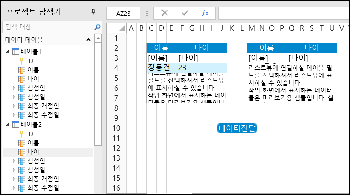 3. 두개의 데이터 테이블을 페이지의 리스트뷰에 바인딩합니다.&#x20;